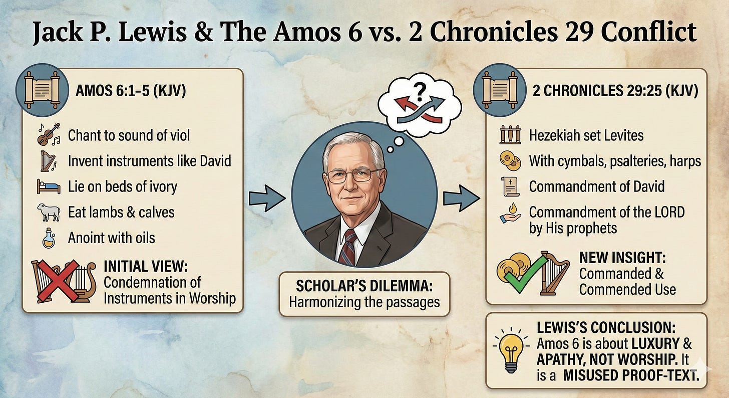Context: Jack P. Lewis was a staunch figure in the Churches of Christ (a cappella tradition). His admission here was not an endorsement of instrumental music in Christian worship, but rather a scholarly correction that Amos 6 specifically is a poor argument to use against it, as the passage condemns luxury and apathy, not worship methodology.