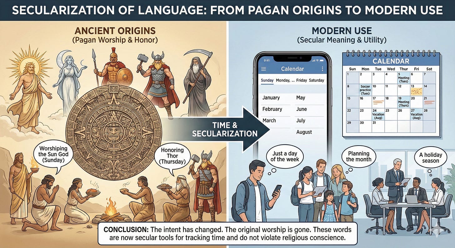 Although the names of our days and months are undeniably derived from pagan mythologies and figures, the worship and honor for those ancient deities no longer reside in those words. The intent has changed.